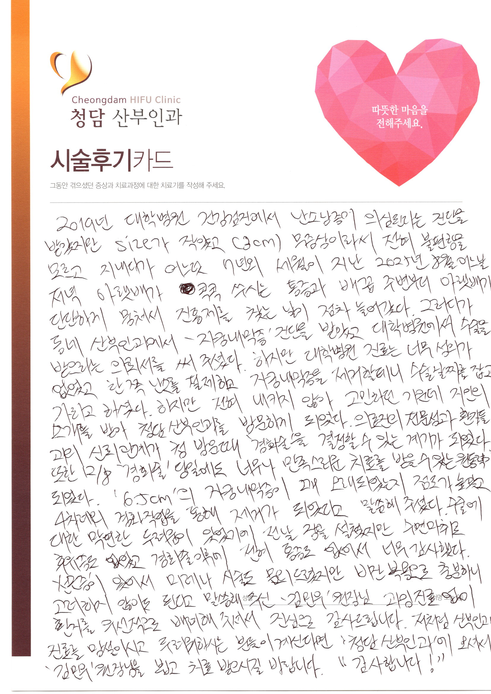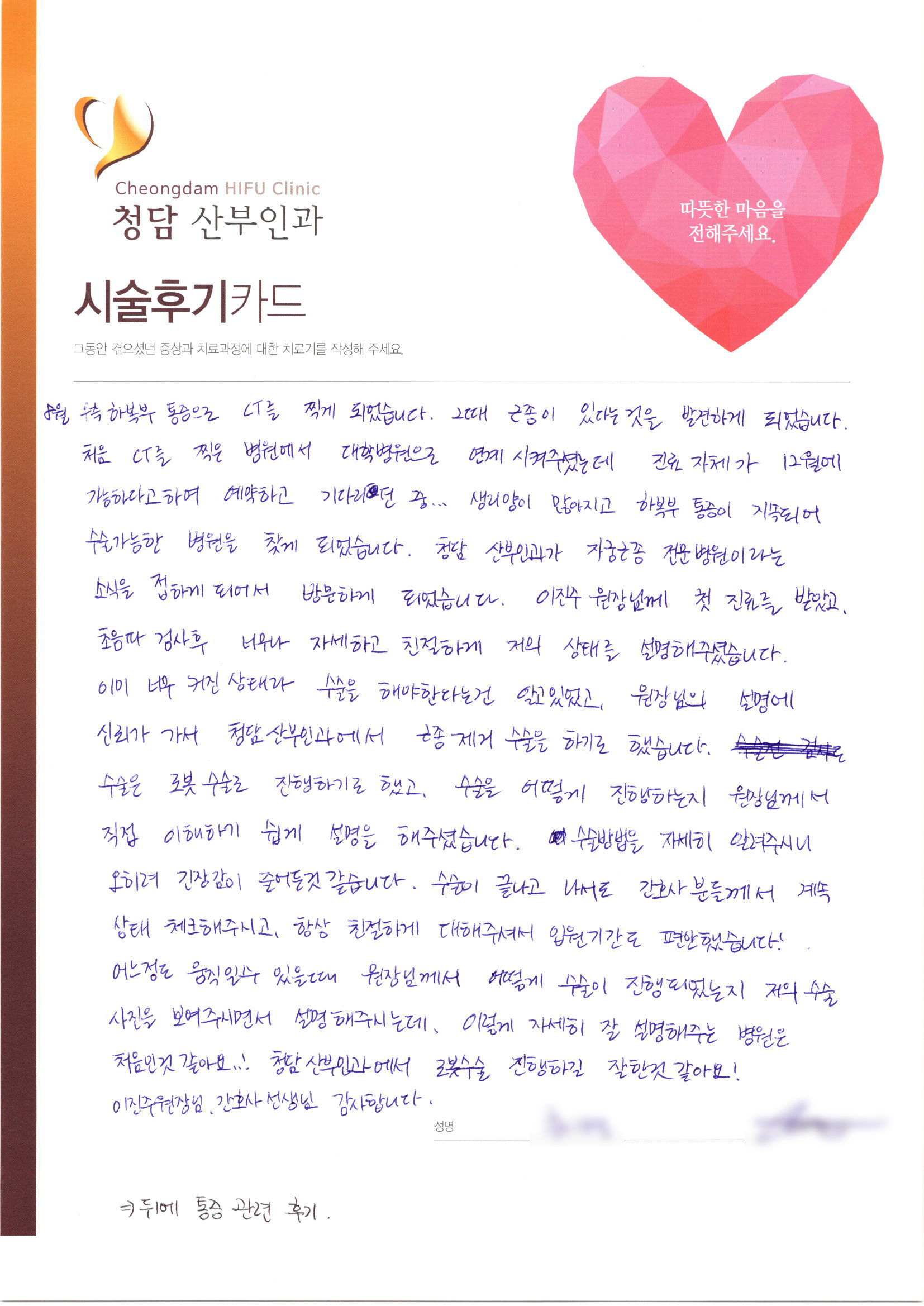 (자궁근종 로봇수술 후기) 원장님의 설명에 신뢰가 가서 청담산부인과에서 근종 제거 수술을 하기로 했습니다.